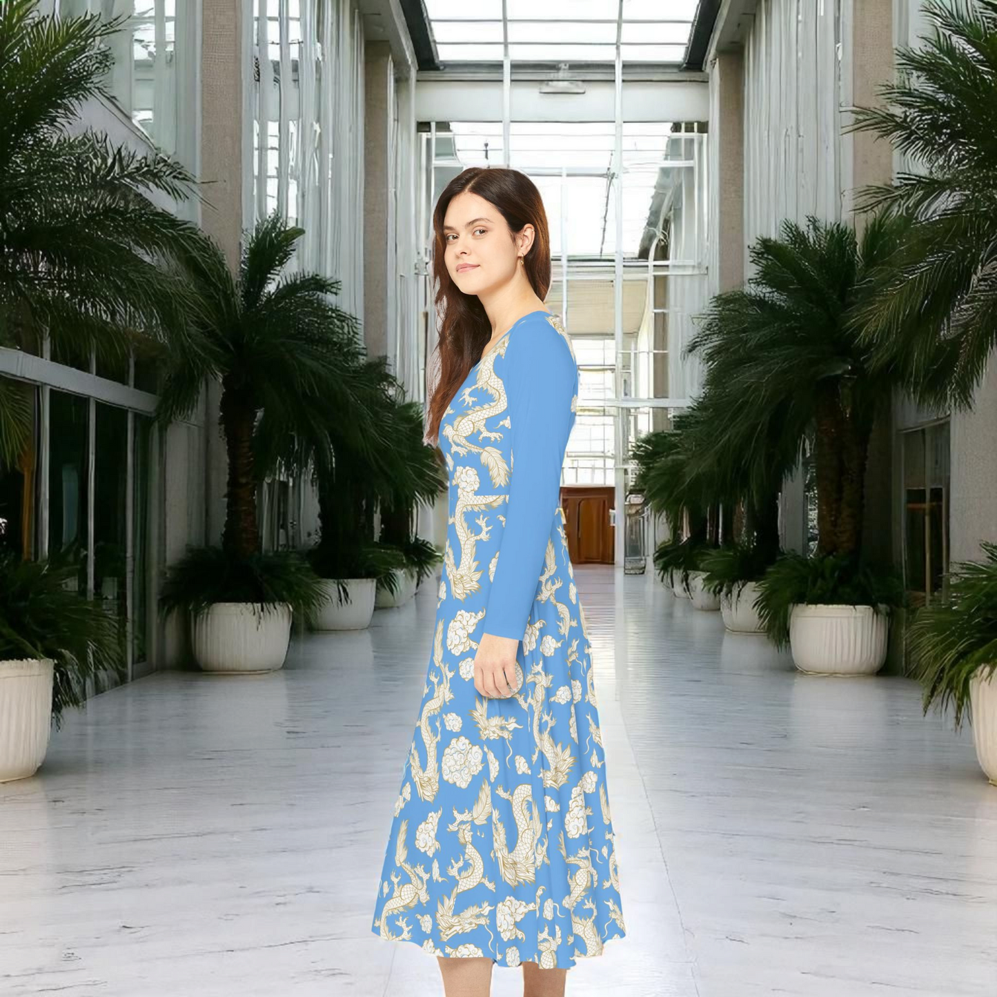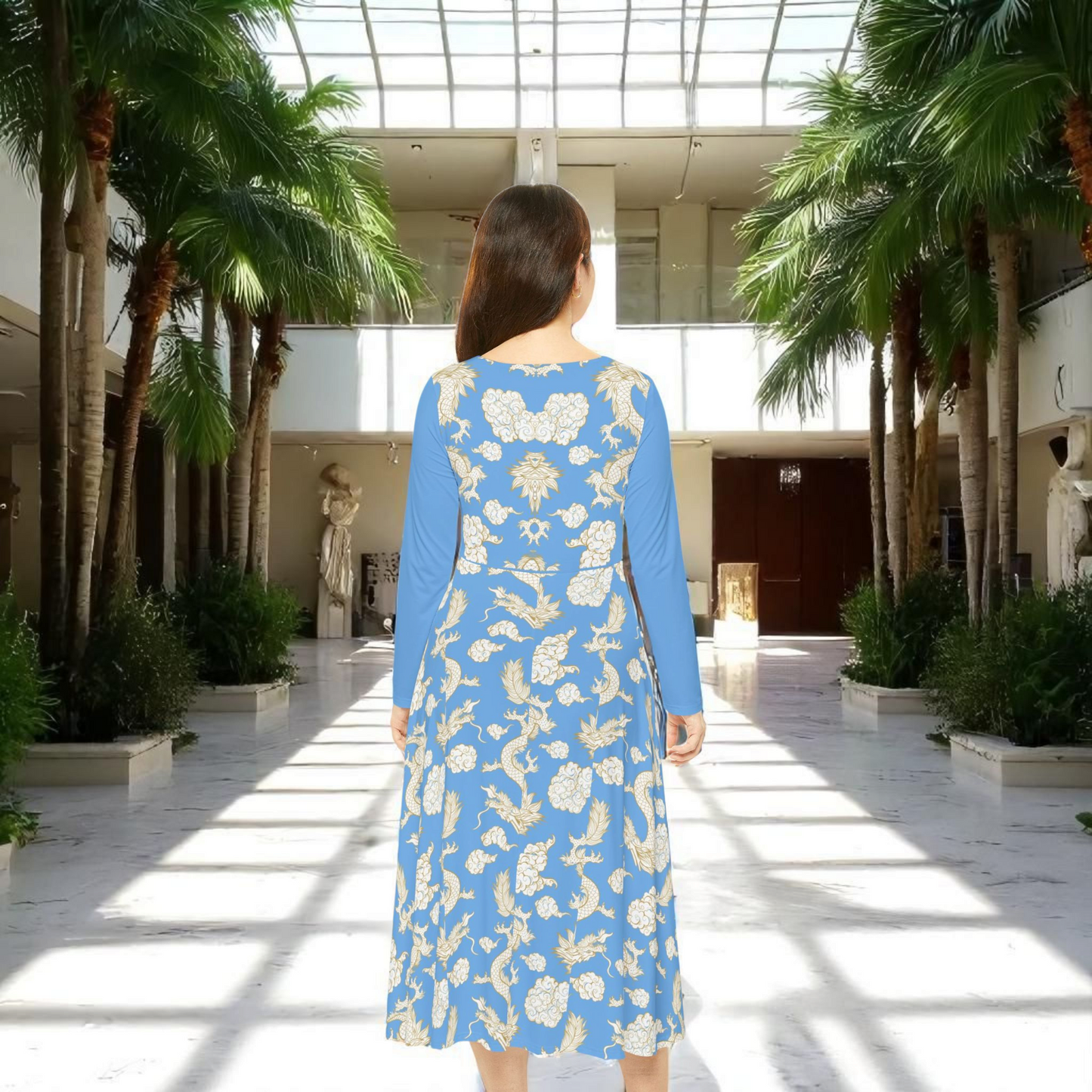 Dragon Print Long Sleeve Dance Dress with a boho style and vintage-inspired design. Perfect for dance wear or a garden party dress. Gives off a whimsical and free-spirited vibe, suitable for women who love to express themselves through unique fashion choices. Ideal for dance performances, garden parties, festivals, and bohemian-themed events.
