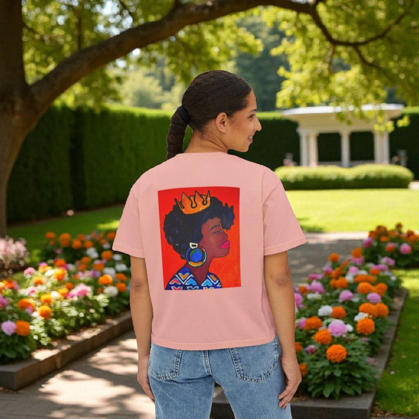 Crowned Black Woman Art Graphic T-Shirt, Afrocentric Women's Boxy Tee. This shirt gives off a confident and empowered vibe, perfect for women who embrace their culture and heritage. Ideal for Black History Month, Women's History Month, cultural events, and everyday wear.