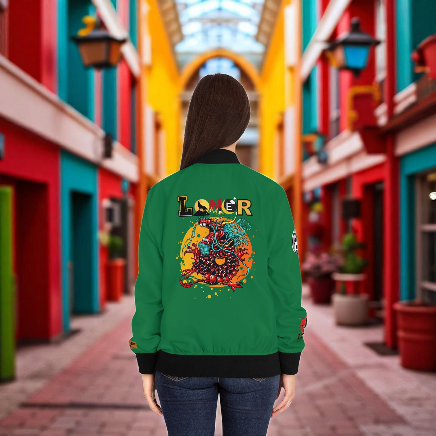 Dragon Graphic Women's Bomber Jacket, Mythical All Over Design, Zip Up Outerwear