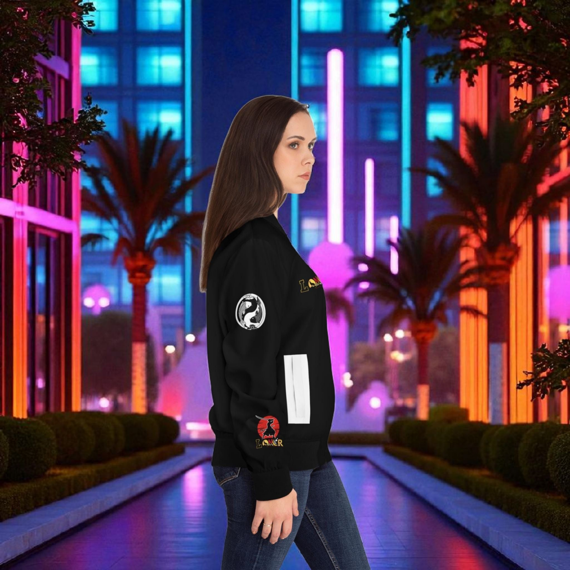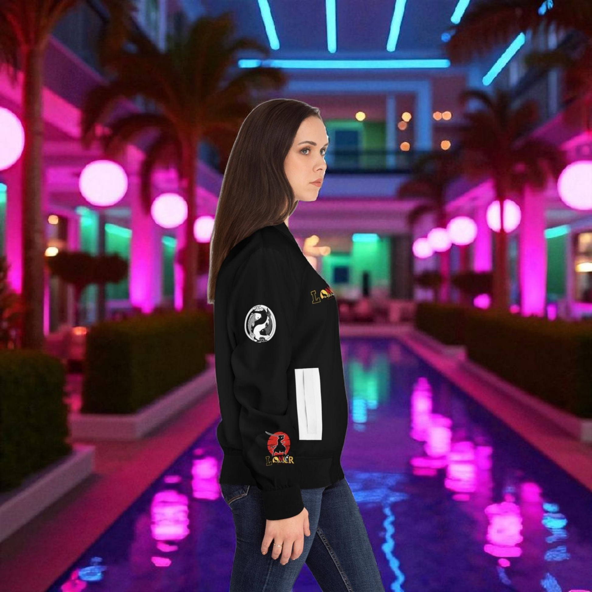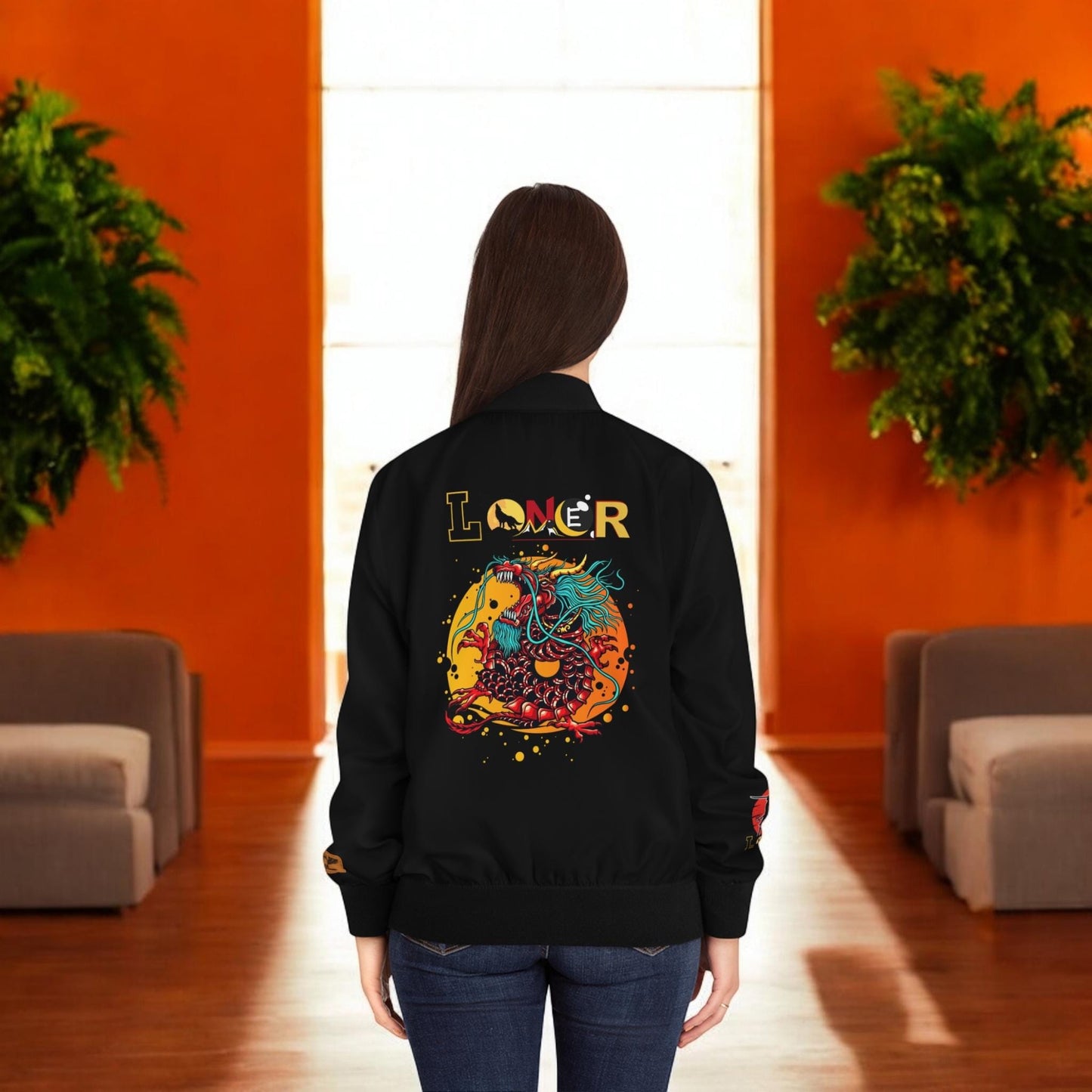 Dragon Graphic Women's Bomber Jacket, Mythical All Over Design, Zip Up Outerwear