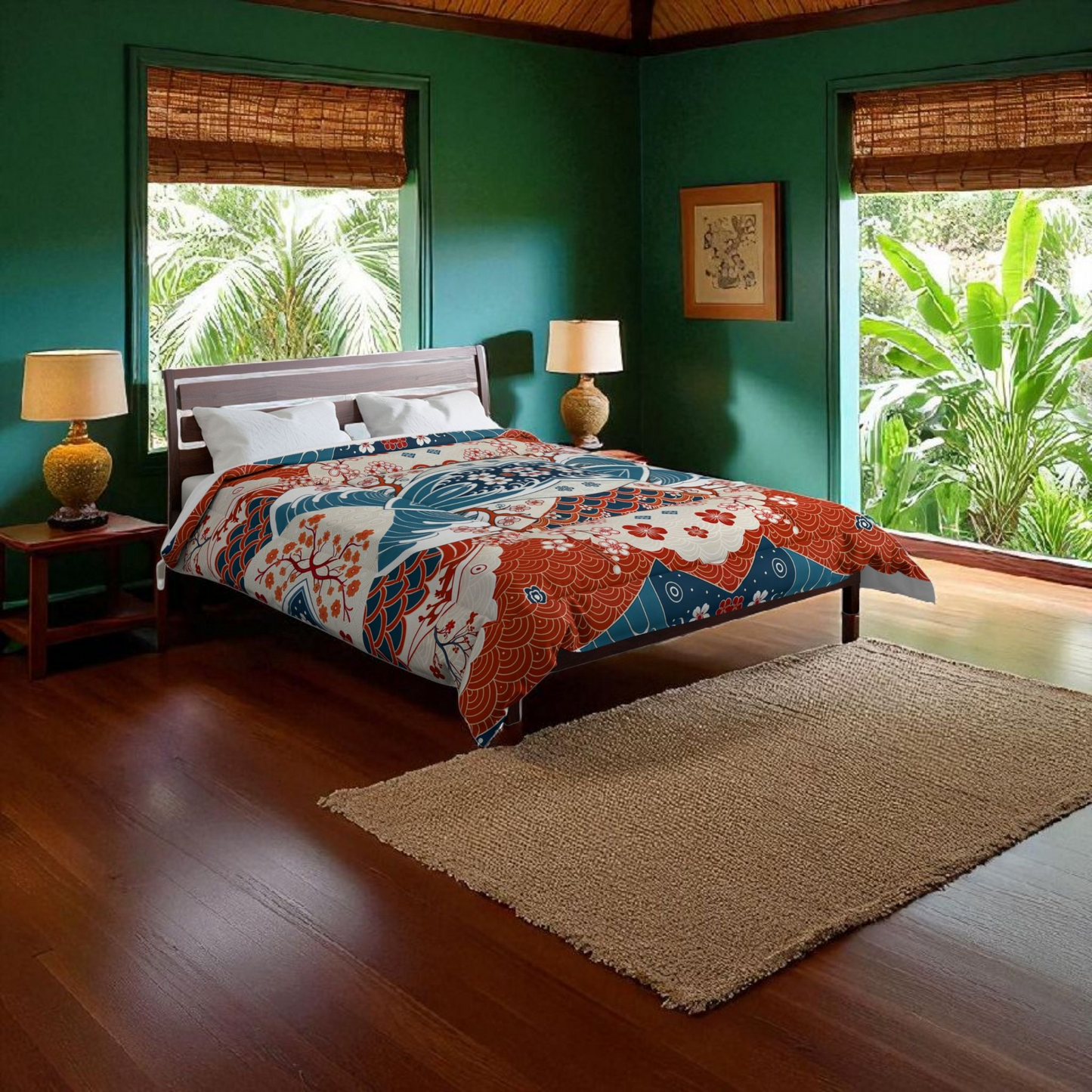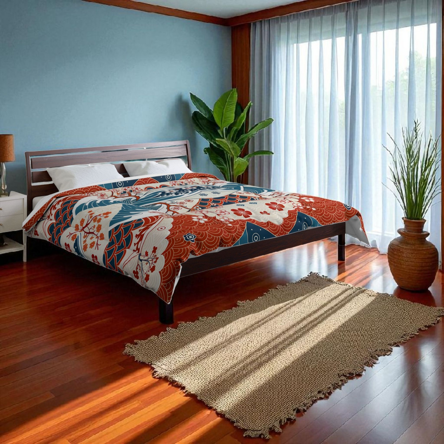Elegant Floral Comforter, Boho Chic Bedding, Japanese Wave Design Quilt