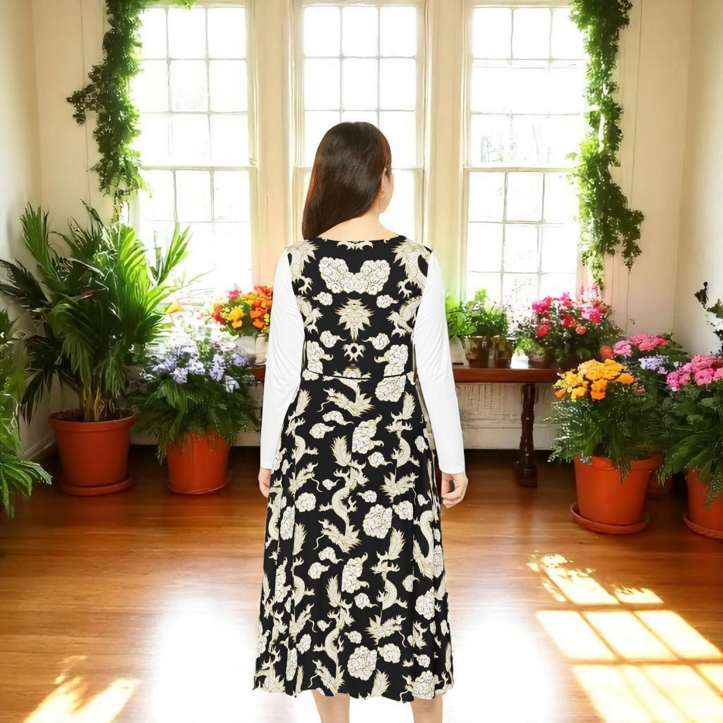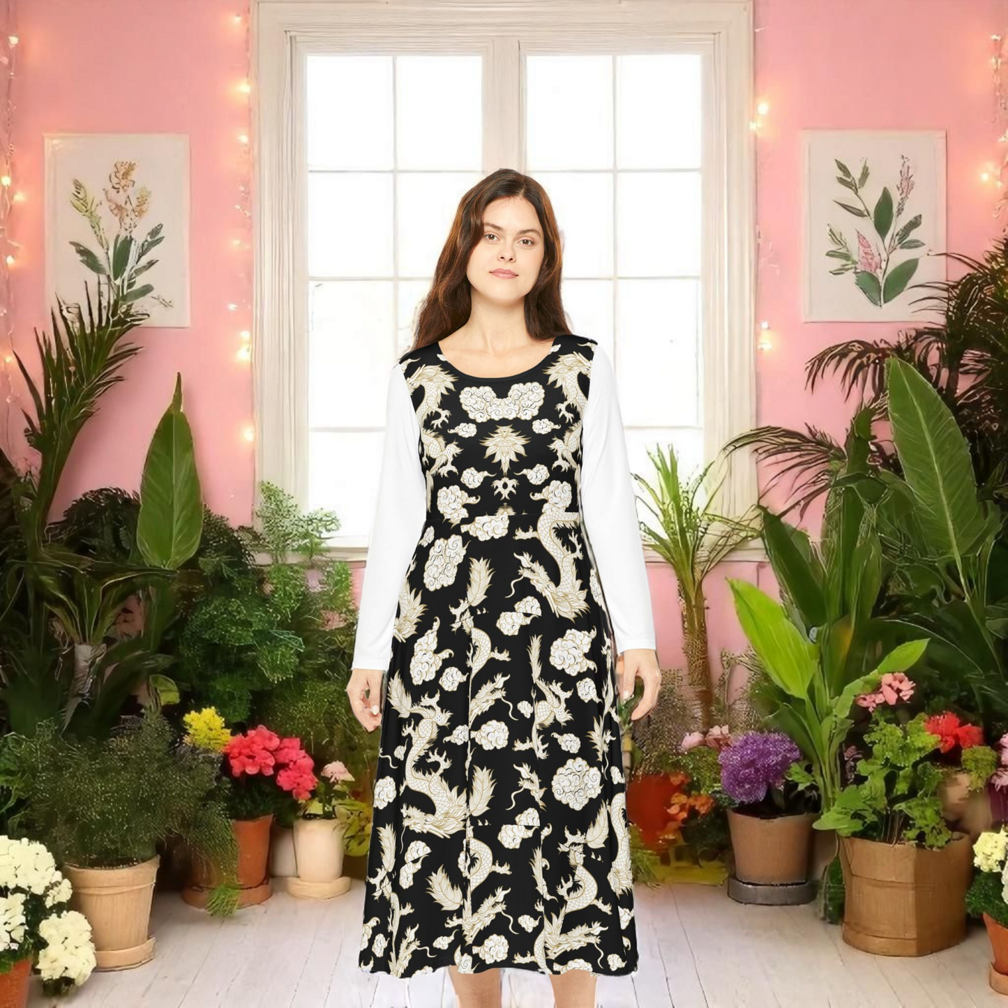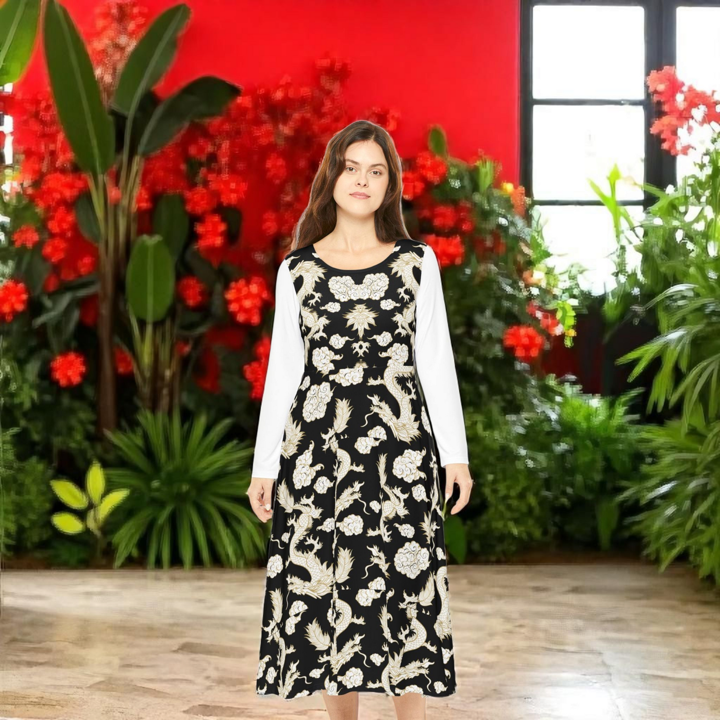 Elegant Dragon Print Long Sleeve Dance Dress | Boho Style, Dance Wear, Vintage Inspired
