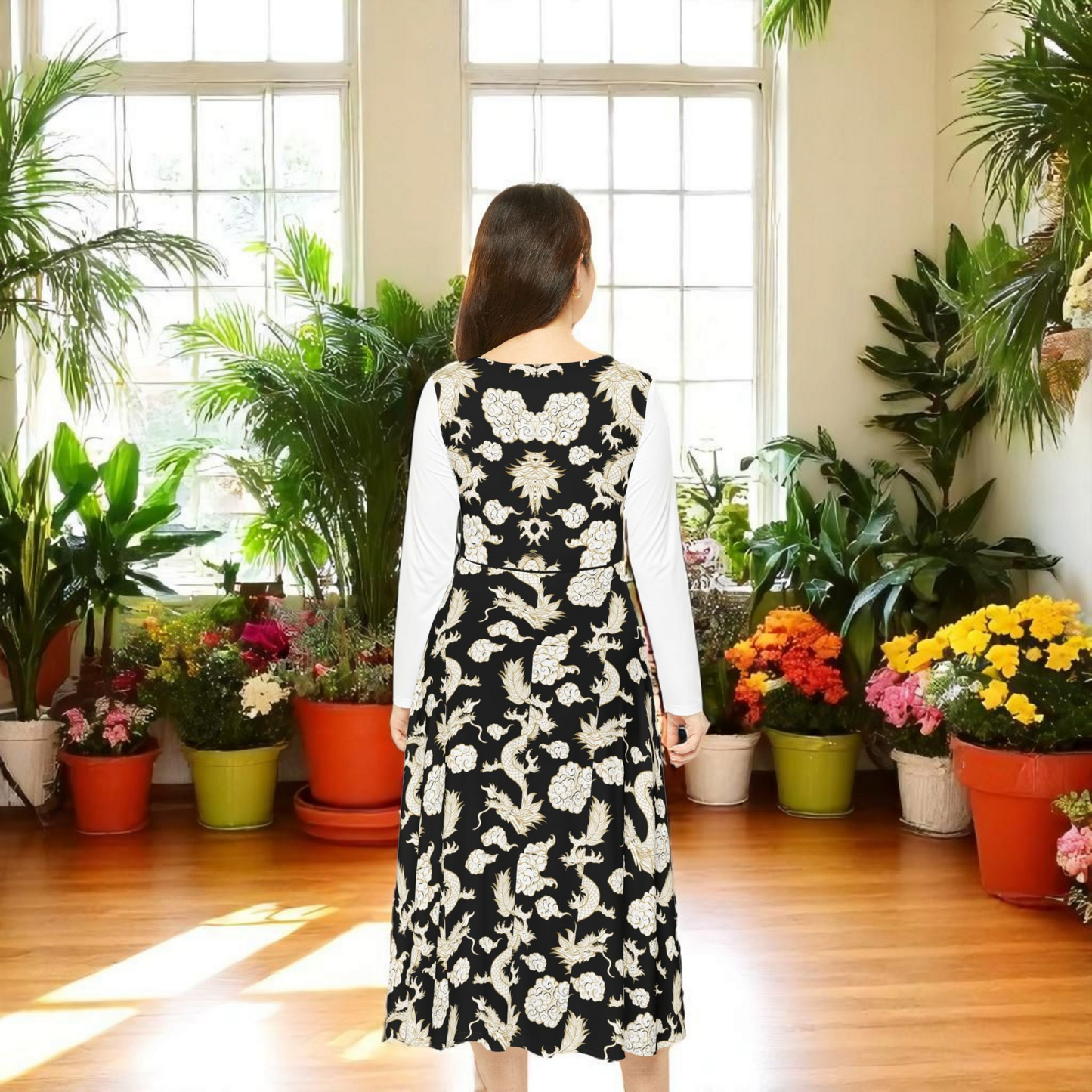 This Dragon Print Long Sleeve Dance Dress exudes a boho style with its vintage-inspired design. Perfect for dance wear or a garden party, this dress is vibrant and chic, making you stand out in any crowd. Ideal for women who love unique and stylish pieces, this dress is perfect for dance performances, garden parties, or festival outings.