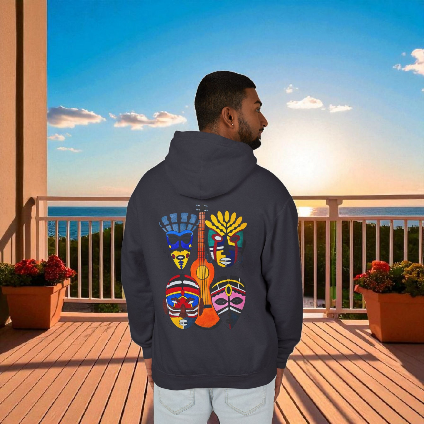 Handcrafted Ethnic Guitar Art on Lightweight Hoodie. This hoodie exudes a unique and artistic vibe, perfect for music lovers and creatives. Ideal for casual wear, gifting for birthdays, music festivals, and artistic events.