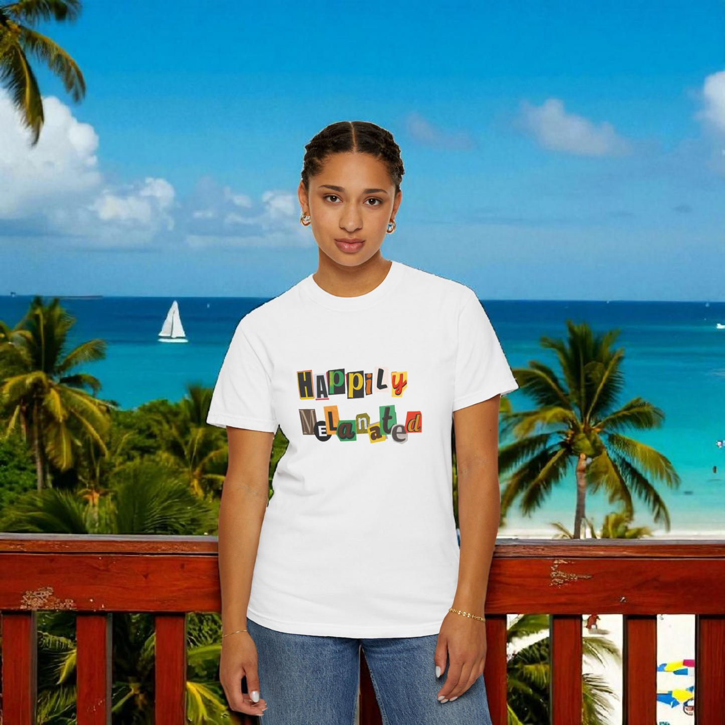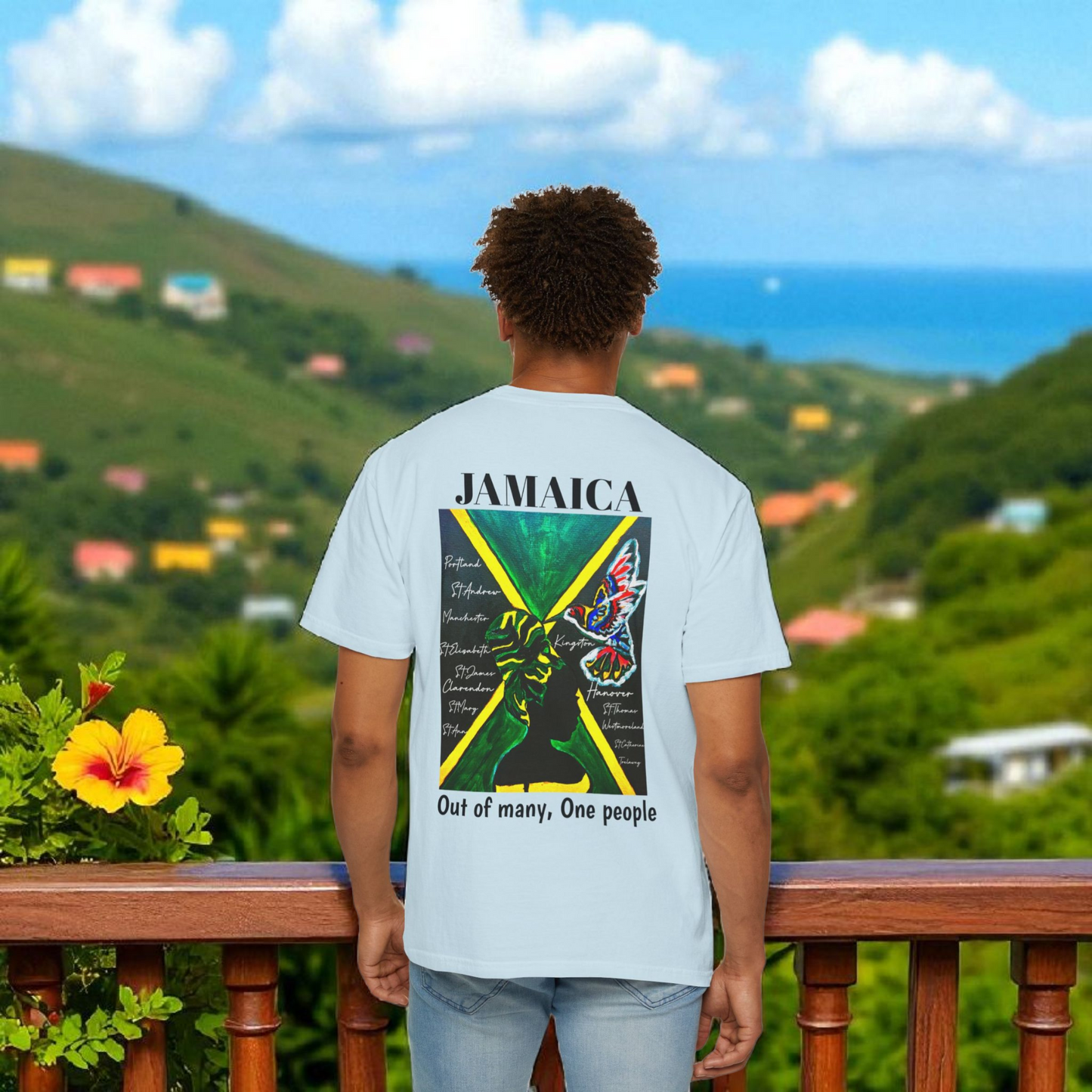 Handcrafted Jamaican Flag Art Graphic Tee, Unisex Garment-Dyed T-shirt that exudes a vibrant and cultural vibe. Perfect for those who love Jamaican culture and want to express it through their clothing. Ideal for anyone celebrating Jamaican holidays or events.
