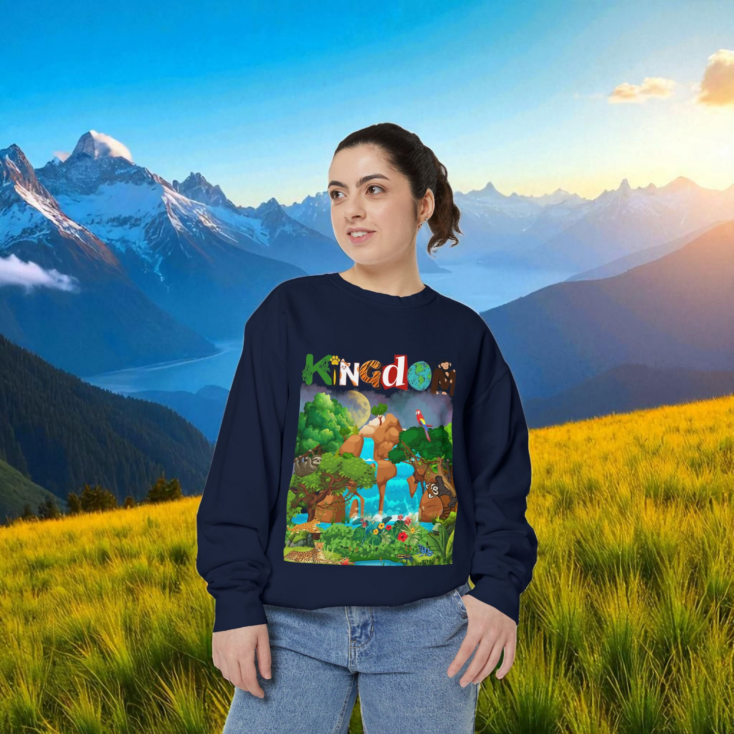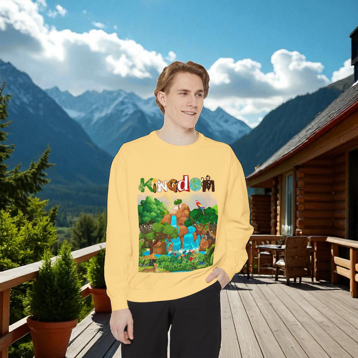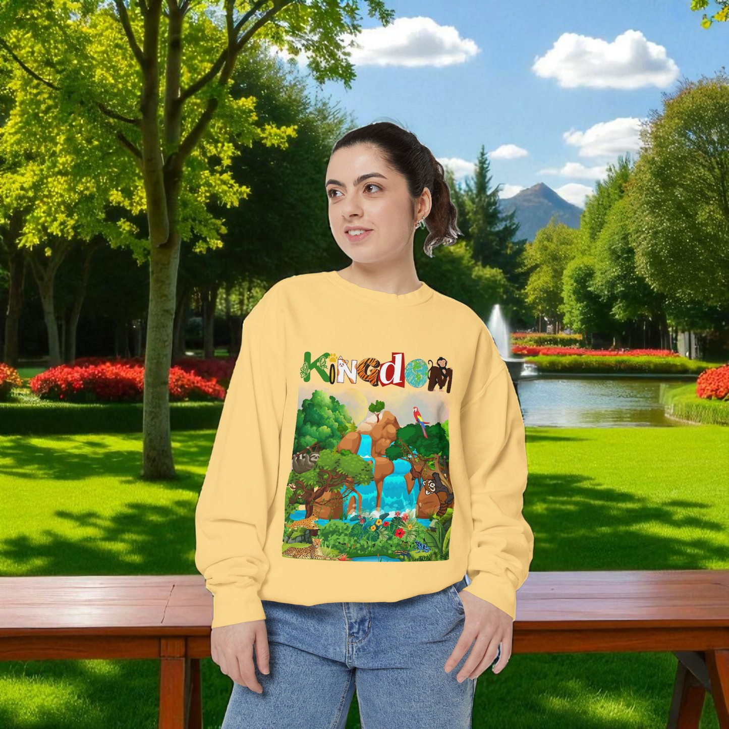 This Jungle Animals Unisex Garment-Dyed Sweatshirt features a beautiful waterfall art design, perfect for animal lovers and nature enthusiasts. The relaxing atmosphere of the jungle combined with the wild animal illustrations creates a unique and stylish look. This sweatshirt is ideal for casual wear or lounging at home, making it a great addition to any wardrobe. Perfect for gifting on birthdays, holidays, or any occasion. Product features - 1x1 Ribbed collar, cuffs and bottom hem for a well-fitted garment - Necktape for added stability and comfort - Back detail with a half-moon neck patch - Made from 80% cotton, 20% polyester for a soft and luxurious feel - Embroidery decoration available on left chest Care instructions - Machine wash: cold (max 30C or 90F) - Non-chlorine: bleach as needed - Tumble dry: low heat - Do not iron - Do not dryclean