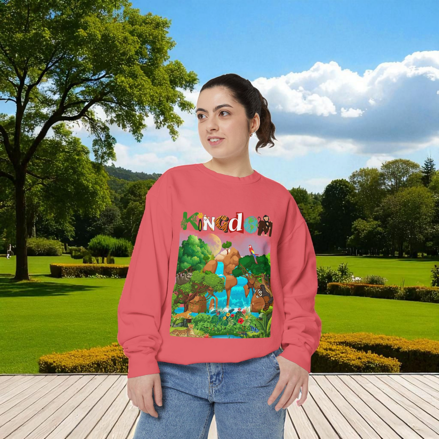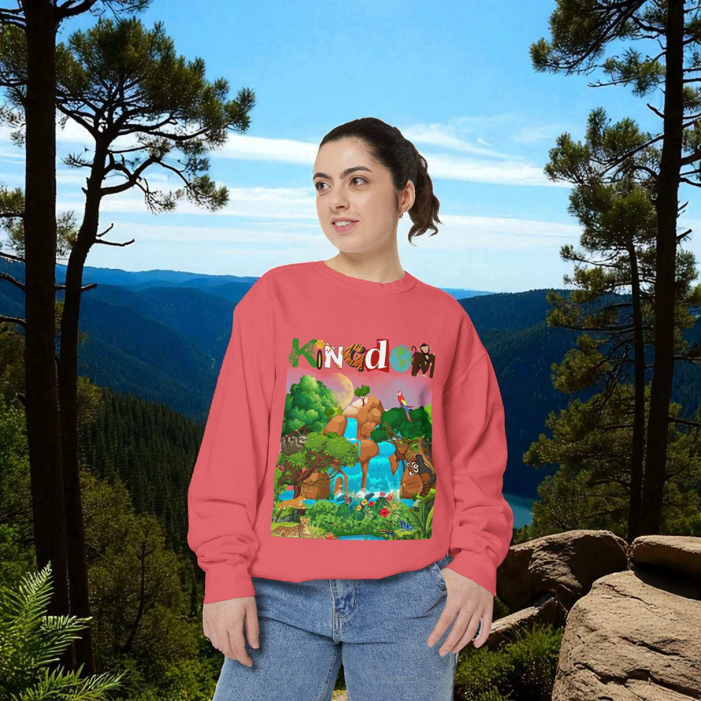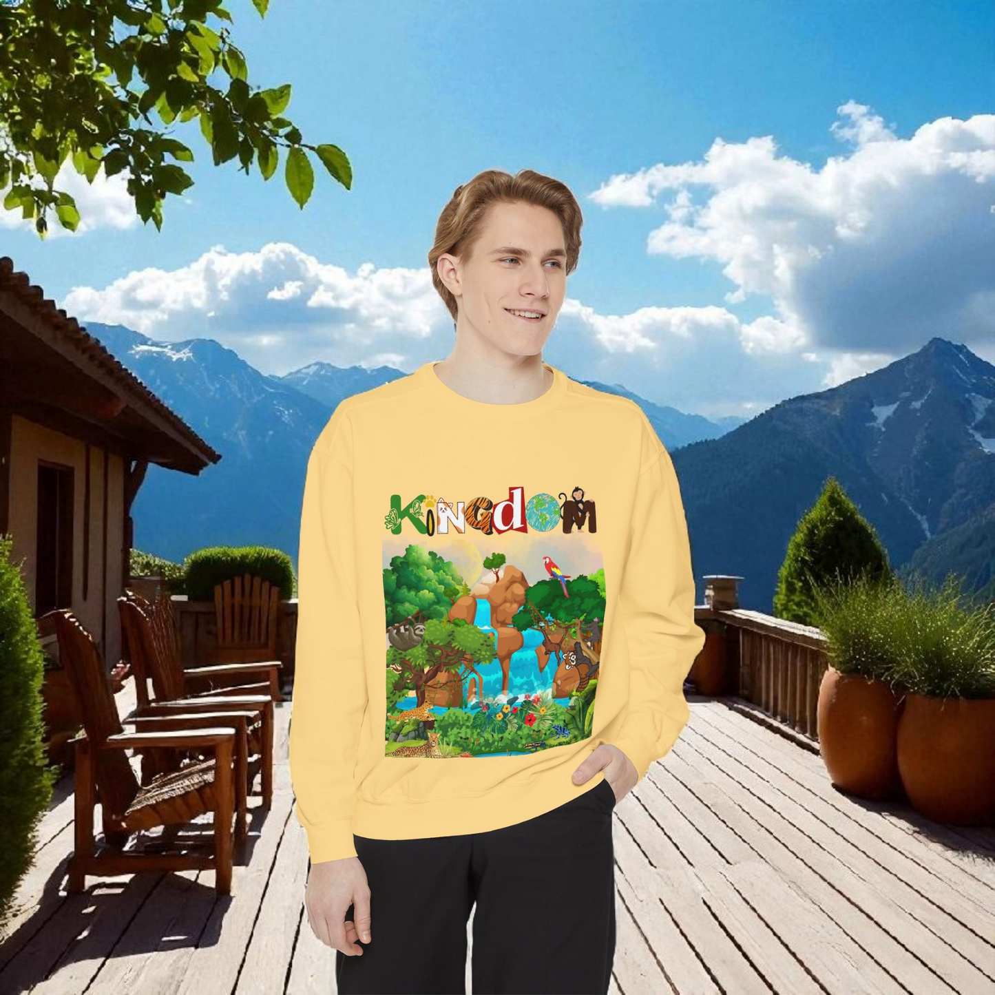 This Jungle Animals Unisex Garment-Dyed Sweatshirt features a beautiful waterfall art design, perfect for animal lovers and nature enthusiasts. The relaxing atmosphere of the jungle combined with the wild animal illustrations creates a unique and stylish look. This sweatshirt is ideal for casual wear or lounging at home, making it a great addition to any wardrobe. Perfect for gifting on birthdays, holidays, or any occasion. Product features - 1x1 Ribbed collar, cuffs and bottom hem for a well-fitted garment - Necktape for added stability and comfort - Back detail with a half-moon neck patch - Made from 80% cotton, 20% polyester for a soft and luxurious feel - Embroidery decoration available on left chest Care instructions - Machine wash: cold (max 30C or 90F) - Non-chlorine: bleach as needed - Tumble dry: low heat - Do not iron - Do not dryclean
