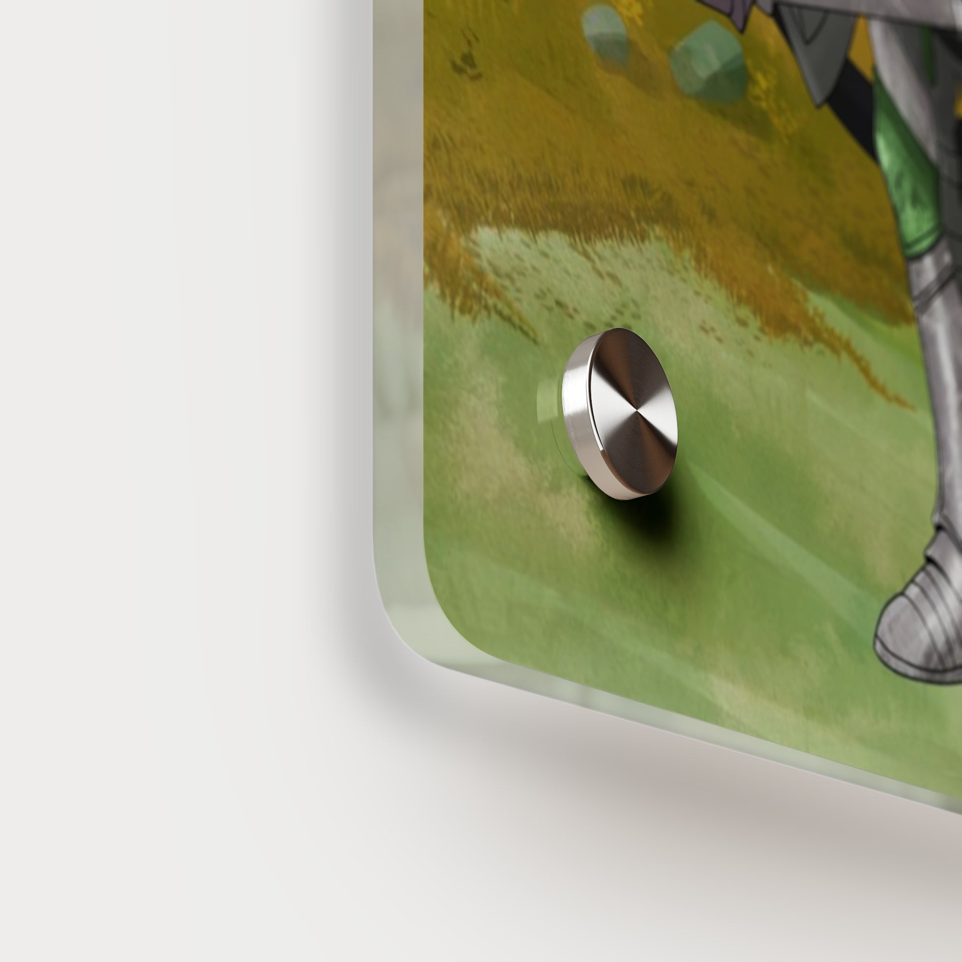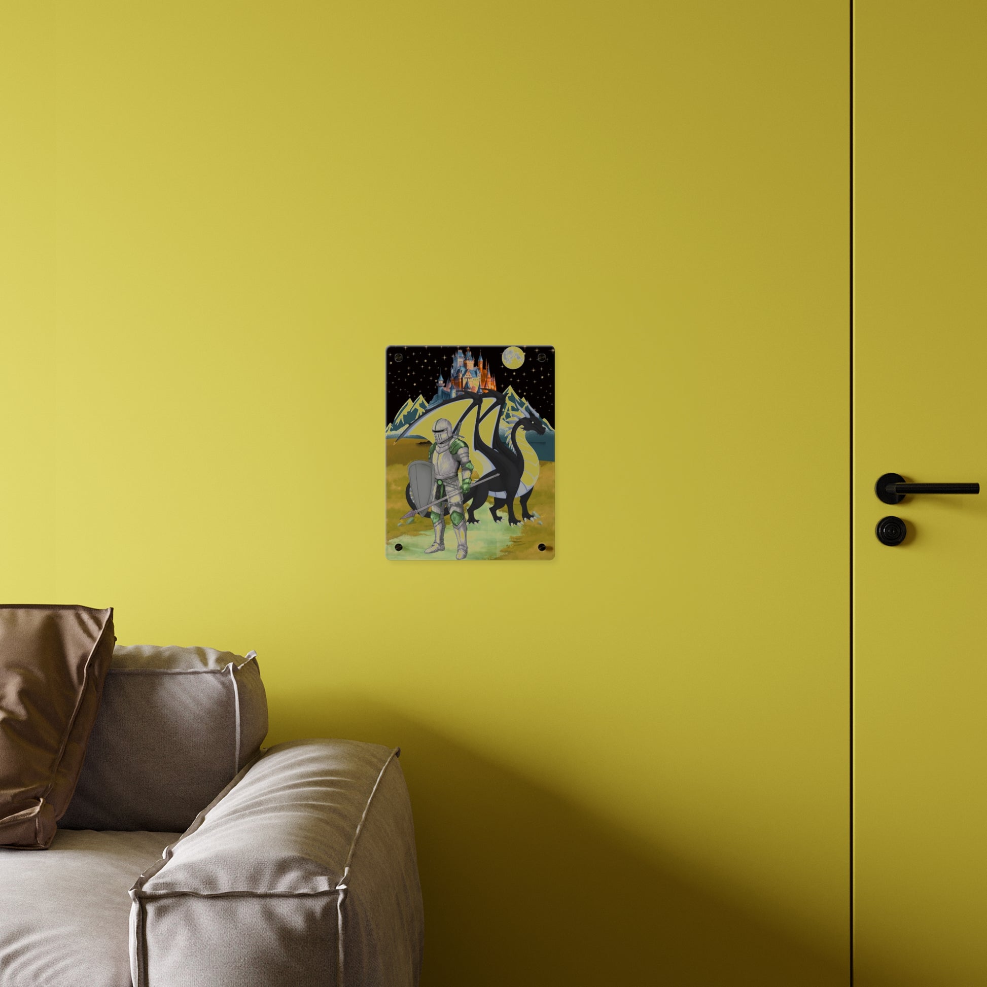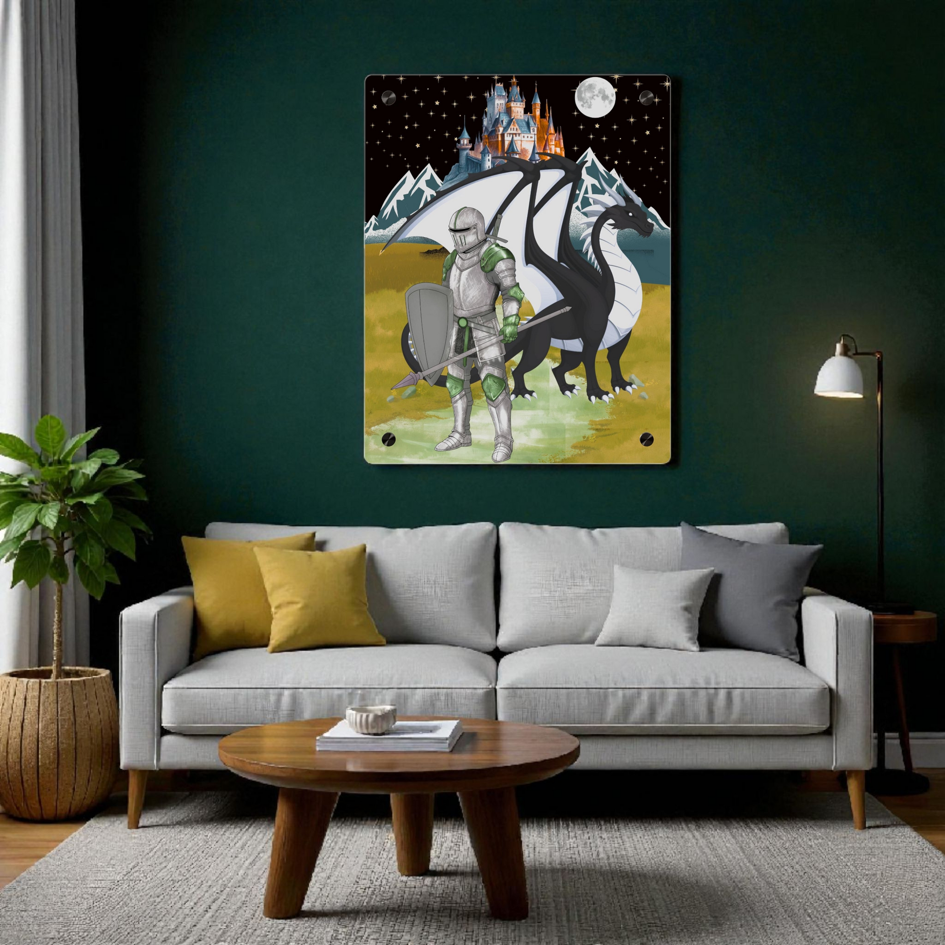 Acrylic Wall Art Panels that bring a medieval fantasy scene to life with crystal-clear depth and bold color. The glossy, transparent acrylic lets light play through the image while a white vinyl backing keeps colors rich and defined. Mounted on brushed silver stand-offs, each panel floats slightly off the wall, giving the knight-and-dragon illustration a gallery-style presence. Choose from multiple shapes and seven sizes to fit hallways, dens, bedrooms, or a themed game room. The durable acrylic surface is strong and stiff, preserving fine printed detail so the castle, moonlit sky, and armored hero remain vivid for years indoors.