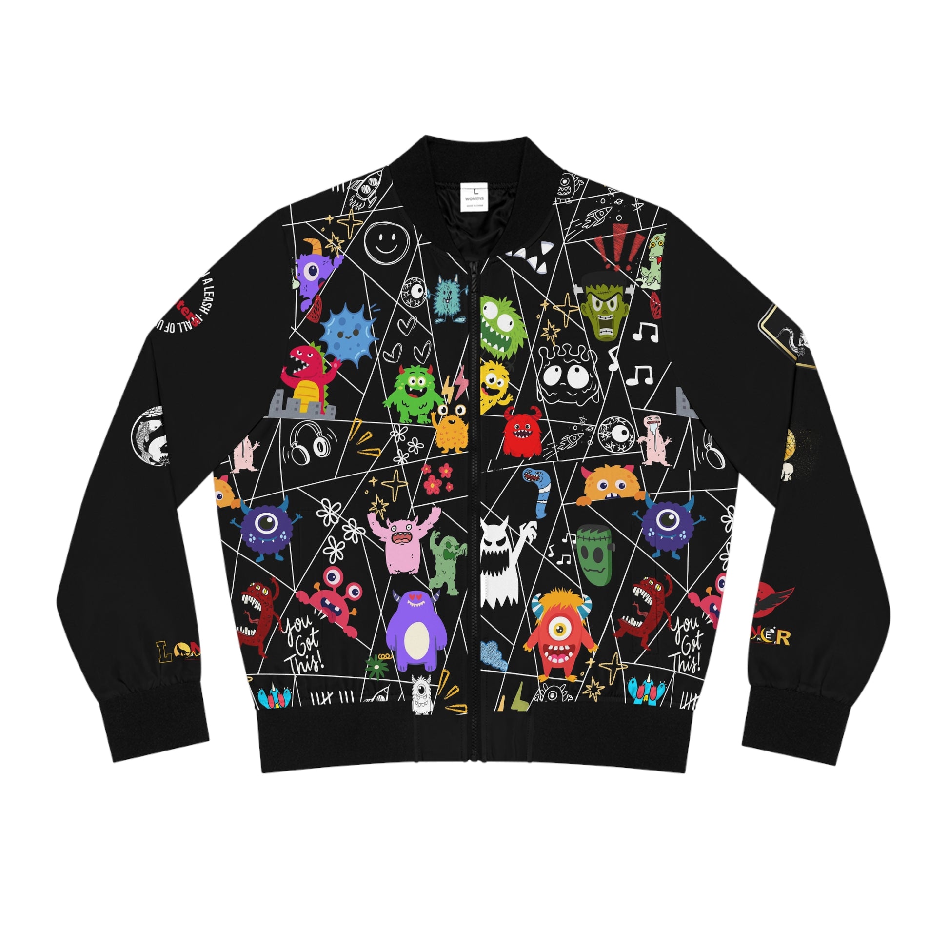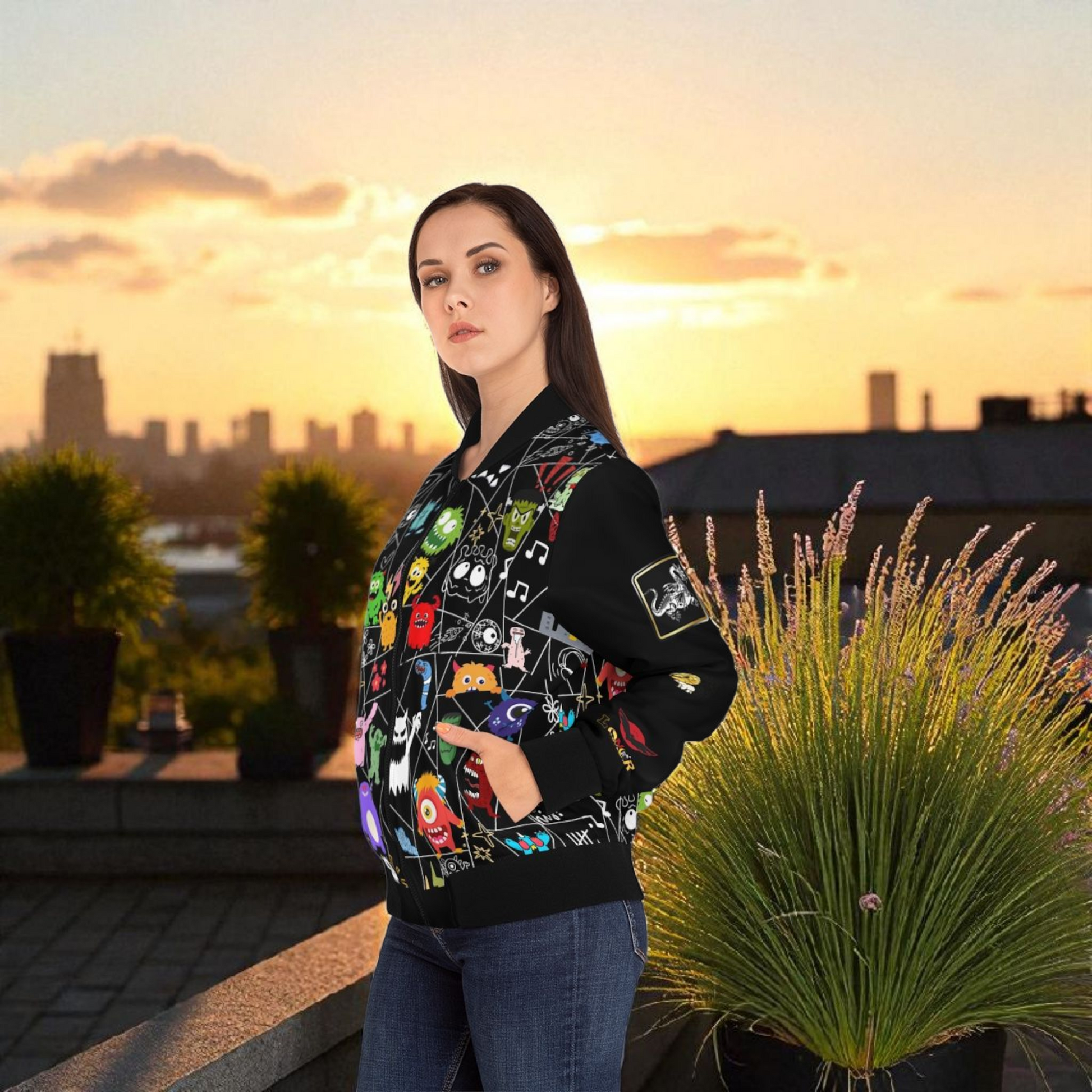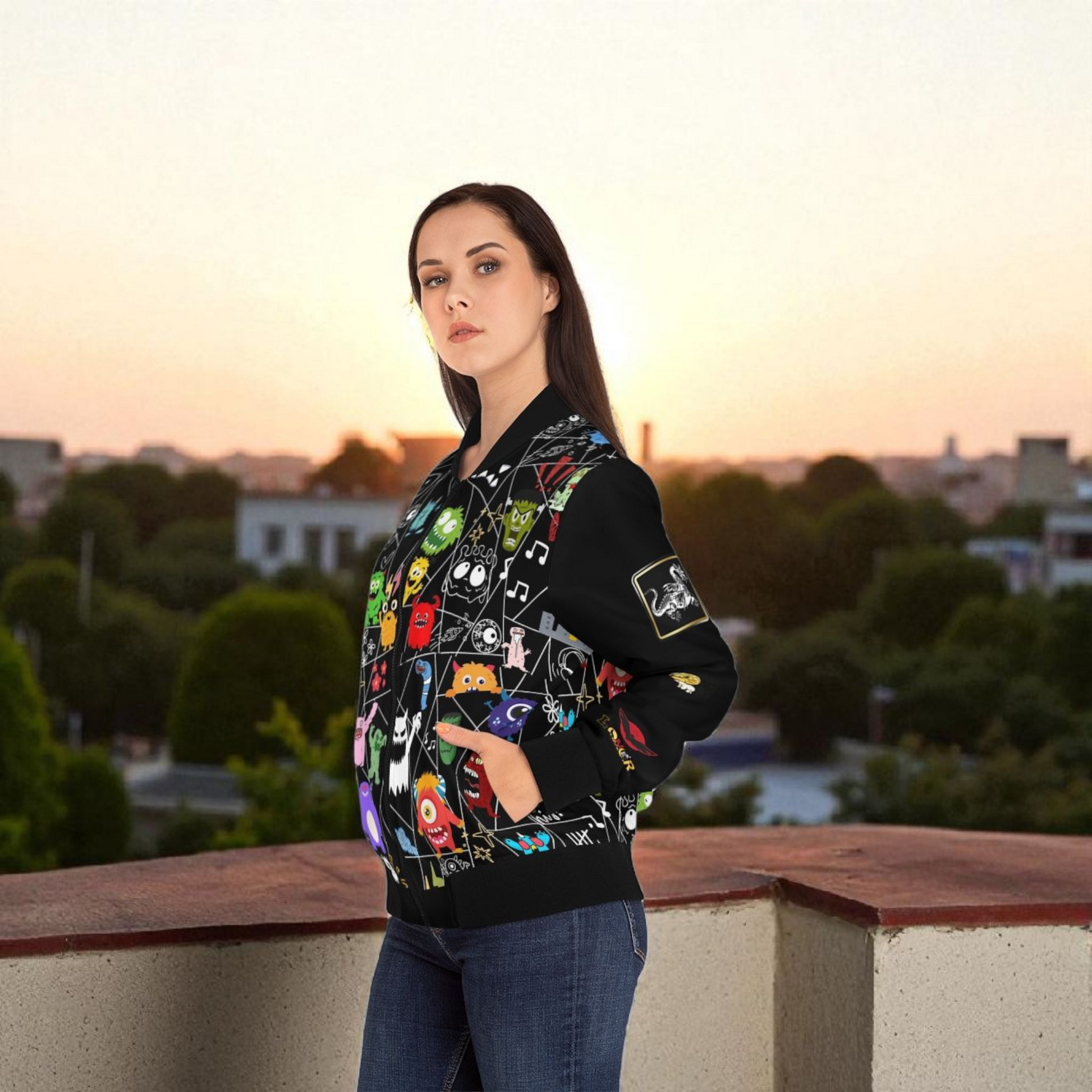 Stay on-trend with this Monster Themed Cartoon Colorful Bomber Jacket, perfect for Halloween fashion and street style. Made of 100% polyester, it's durable and comfortable. Featuring a ribbed collar, cuffs and bottom hem, front pockets, and a metal zipper closure, this jacket is a stylish addition to any wardrobe. Ideal for women who love fun and quirky fashion, and perfect for Halloween celebrations and everyday wear.