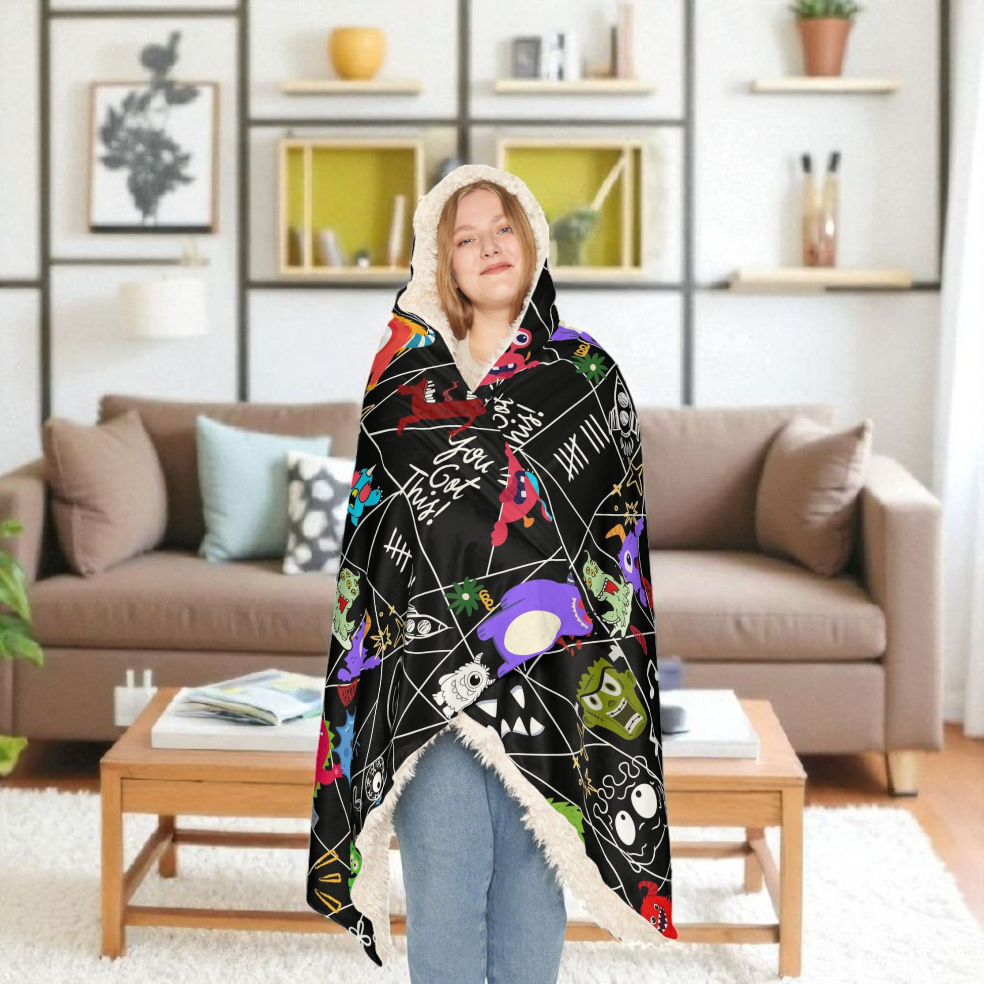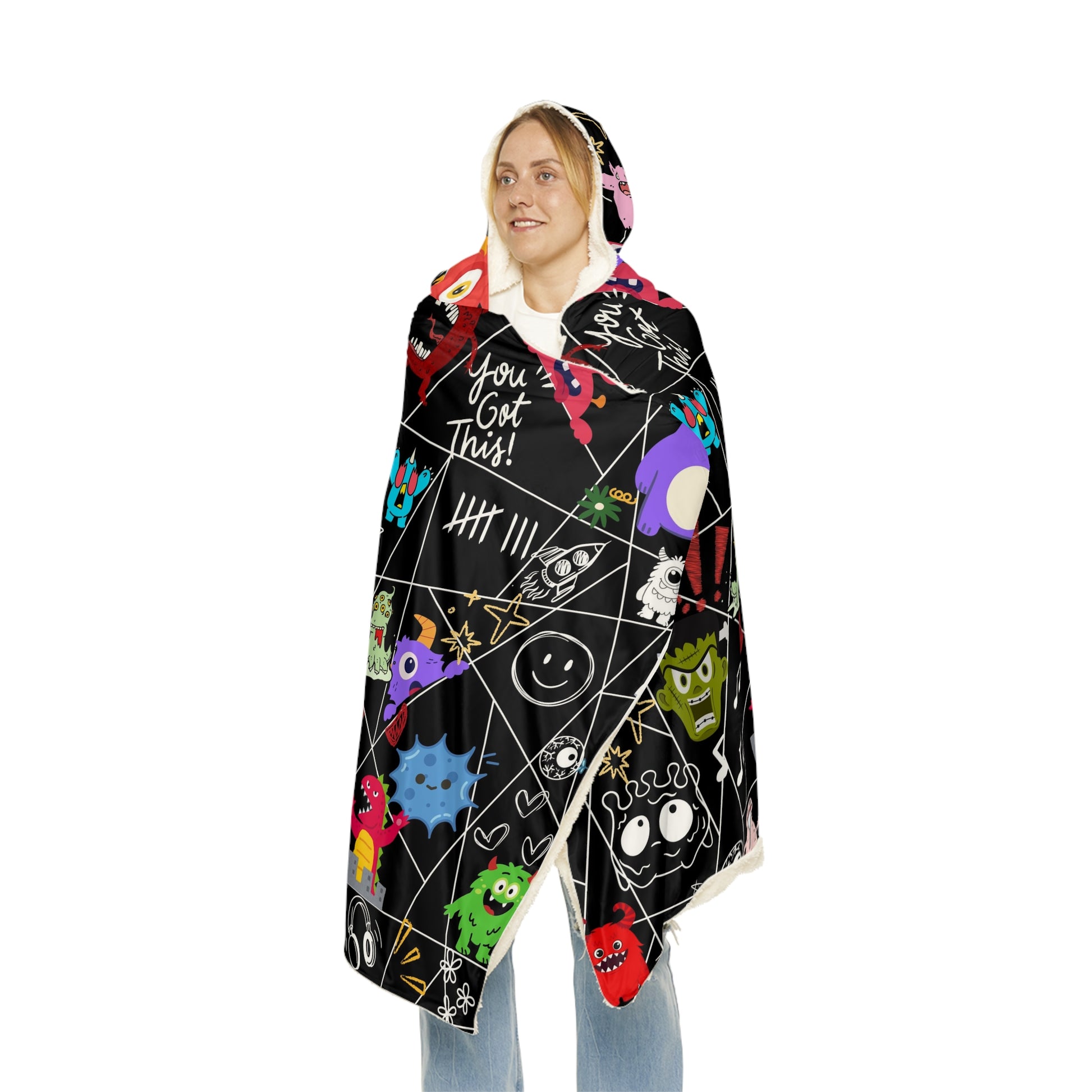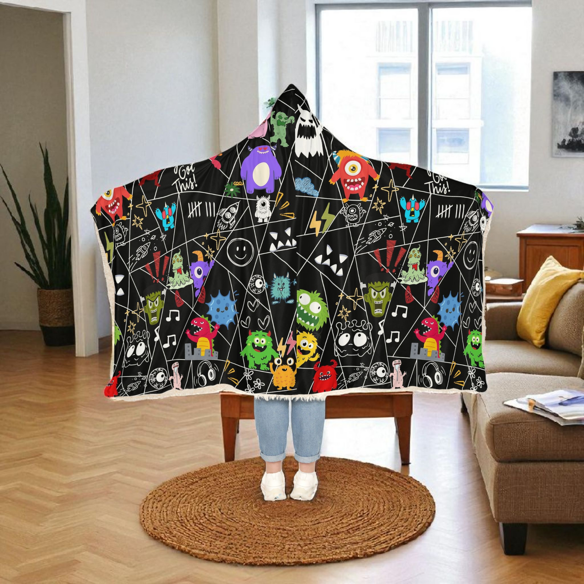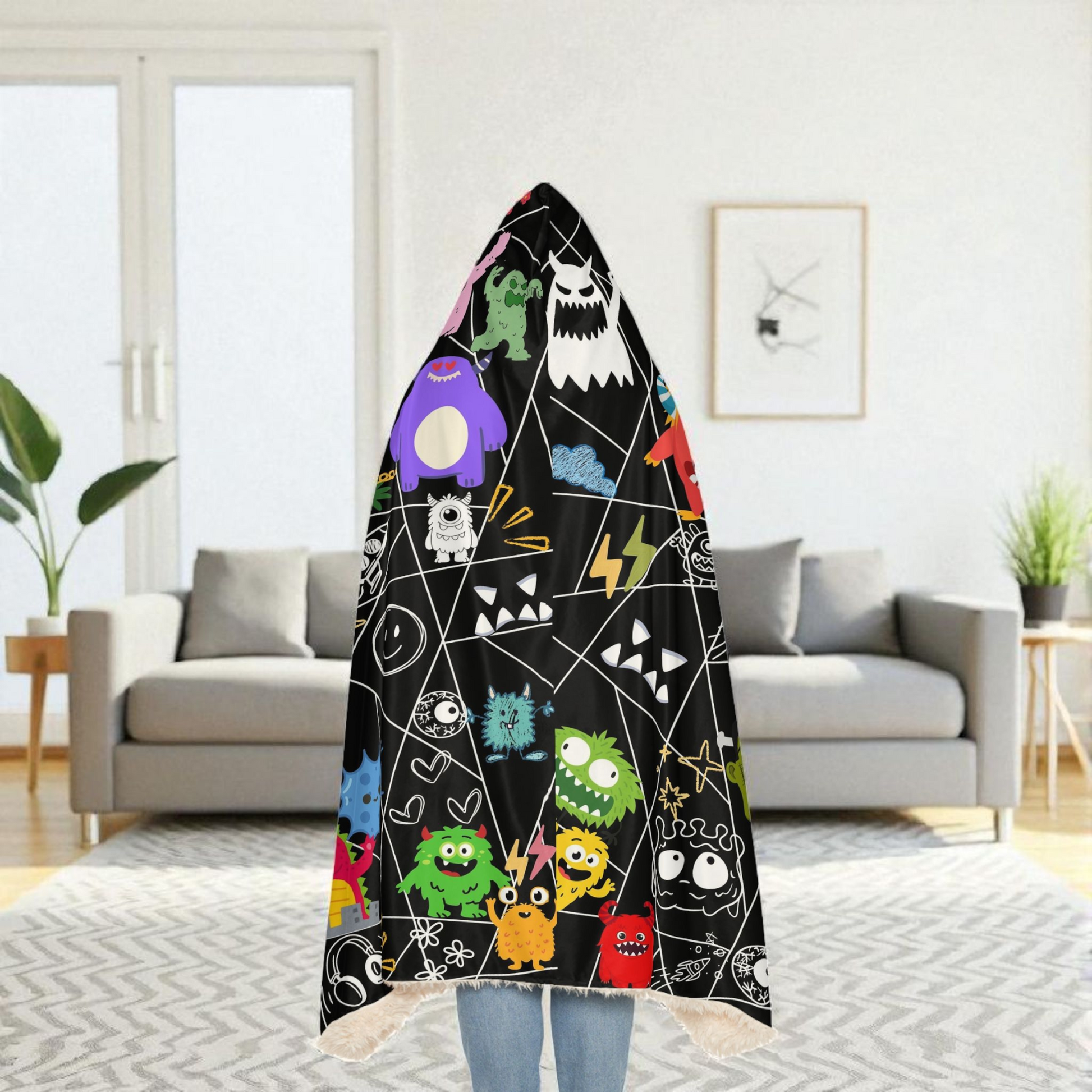 Whimsical Monsters themed Graphic Hooded Blanket with vibrant colors and playful design. Perfect for cozy nights on the couch or adding a touch of fun to your home decor. Ideal for monster lovers and fans of quirky designs. Great for gifting on birthdays, Halloween, or as a unique housewarming present.