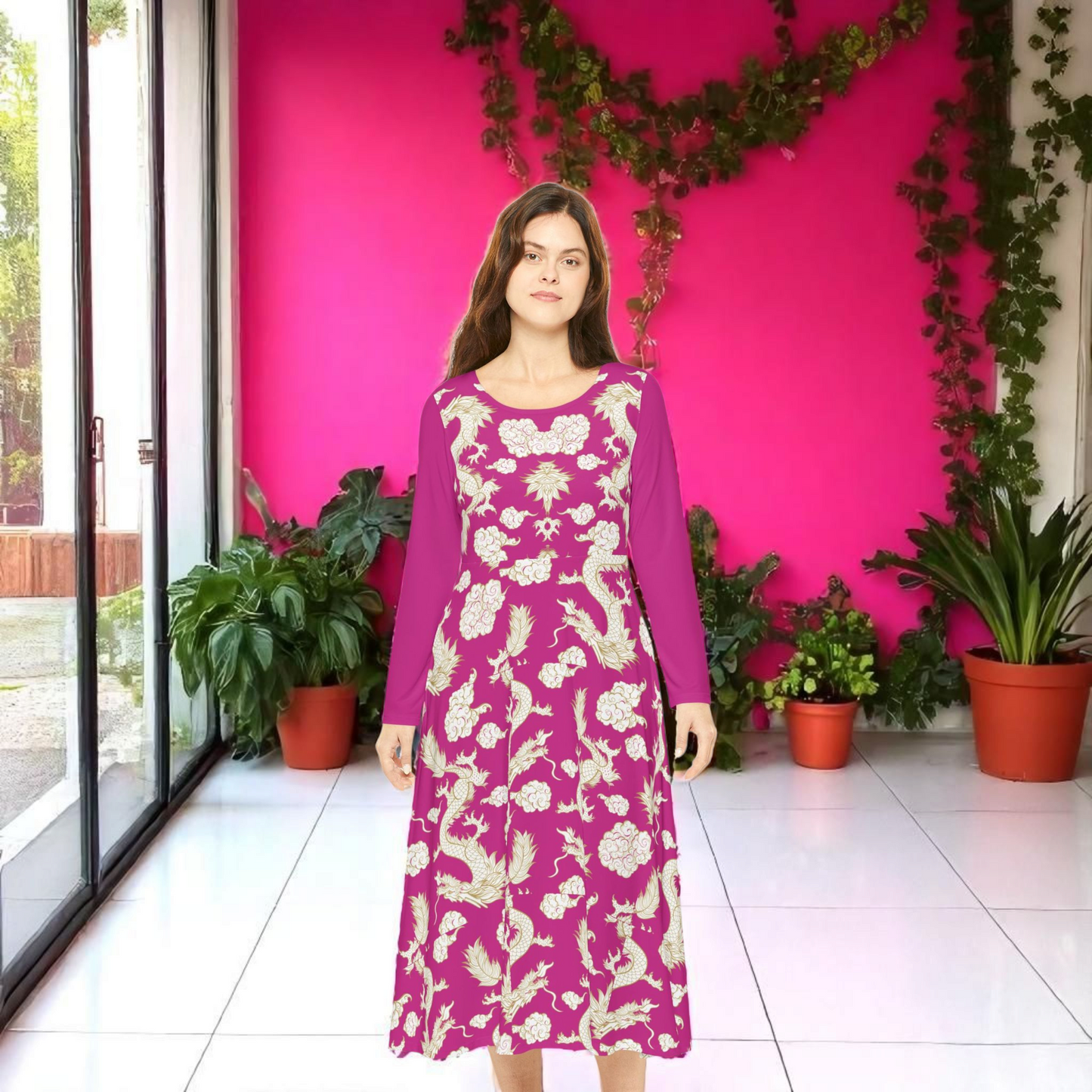 This Dragon Print Long Sleeve Dance Dress exudes a boho style, perfect for dance performances or a vintage-inspired garden party. The vibrant colors and unique dragon print make this dress stand out in any crowd. It is ideal for women who love expressive and artistic fashion. Perfect for dance events, garden parties, and bohemian celebrations.