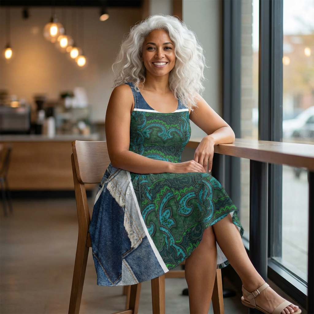This mid-length skater dress brings effortless movement and bold pattern play to your everyday wardrobe. The fitted bodice with a high scoop neckline flows into an asymmetrical skirt that twirls with every step. Printed in rich teals and forest greens with paisley-inspired motifs and contrasting denim-like panels, the design feels both vintage and modern—great for layering under a chunky cardigan or wearing alone on sunlit afternoons. The fabric’s stretch gives a close, comfortable fit while the medium-heavy weight keeps the skirt’s shape. Expect crisp, vibrant colors that hold up wash after wash and reinforced hems for long wear. Wear it to weekend markets, city walks, casual dates, or any day you want artful, wearable style.