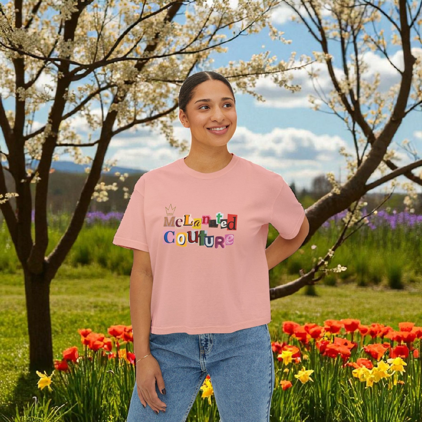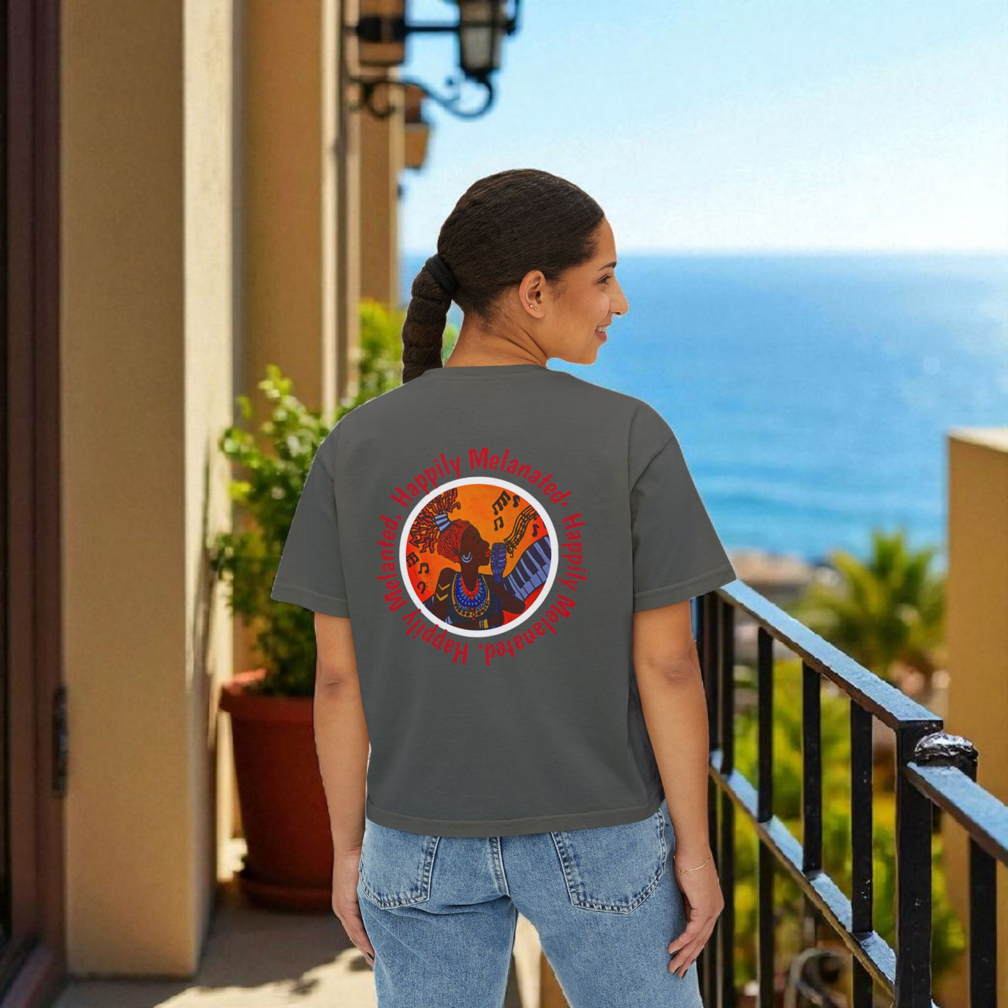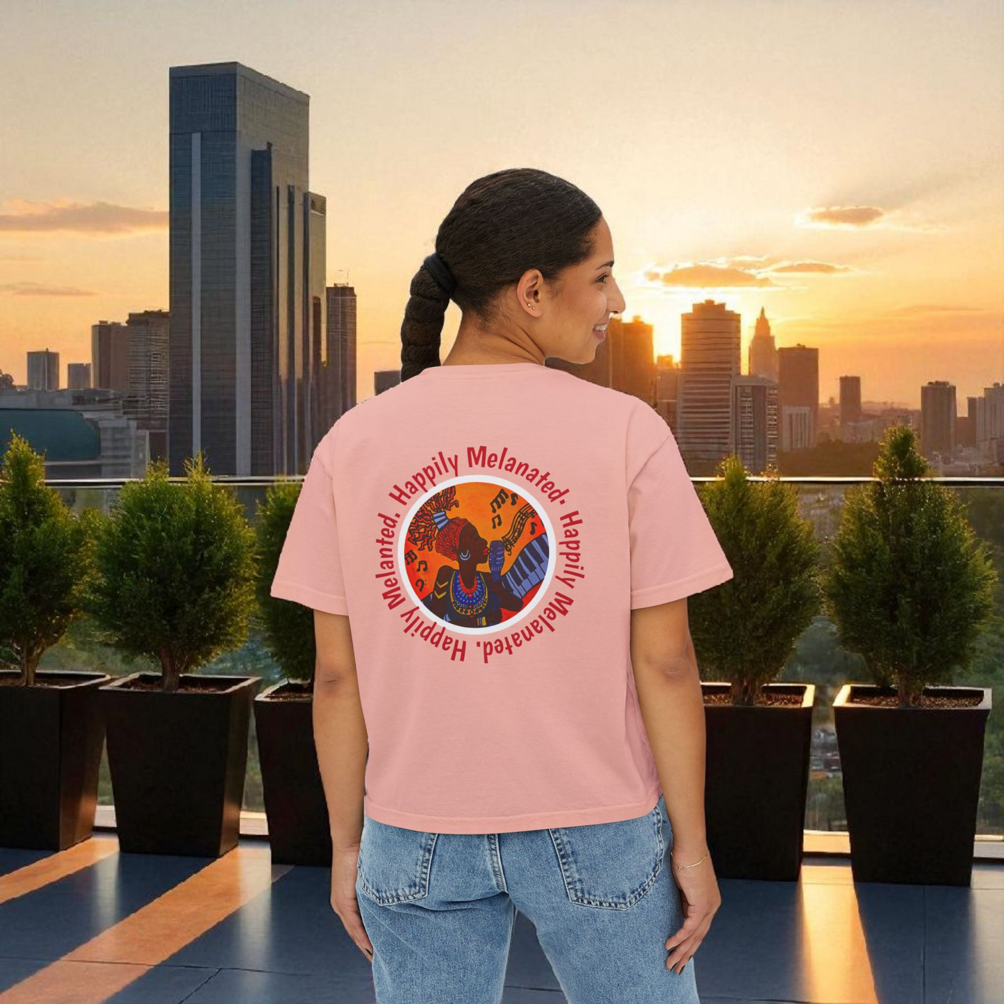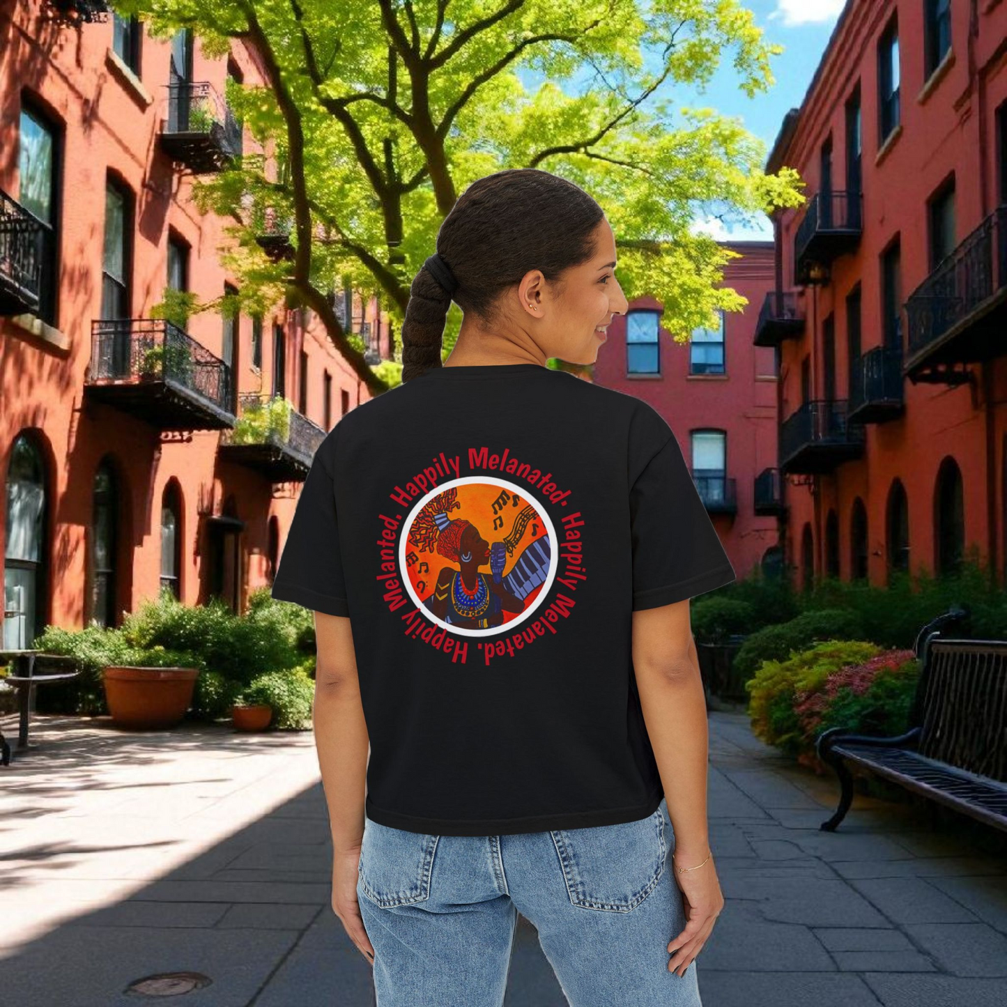 An Afro music cartoon oversized boxy tee perfect for a casual and fun look. This t-shirt offers a comfortable boxy fit with a slightly cropped seamless body, made from 100% ring-spun US cotton. The pigment dye colors provide a vintage look that will last, making it a unique addition to your wardrobe. Ideal for music lovers and those who enjoy a relaxed style. Perfect for music festivals, casual wear, and lounging.